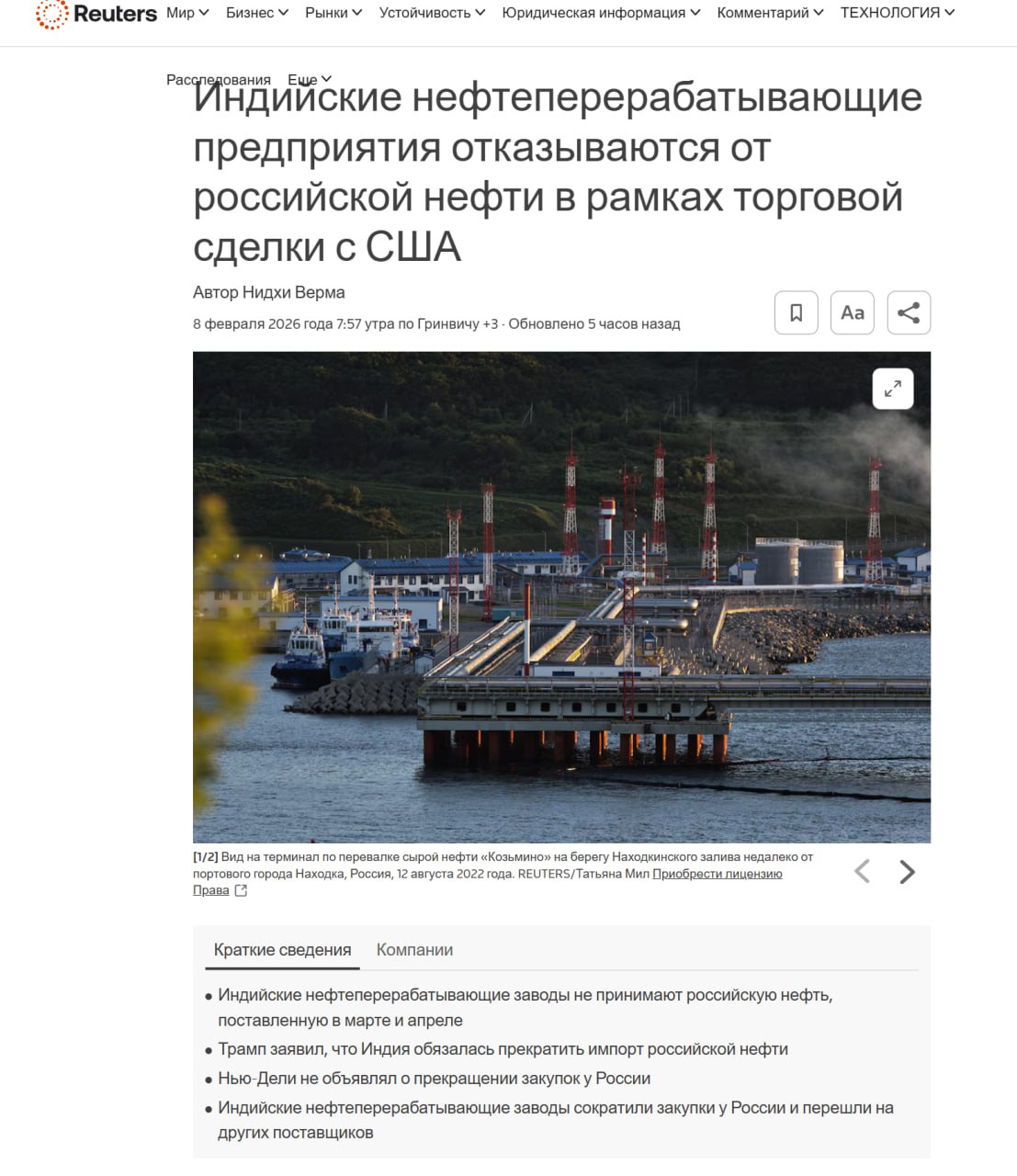 Reuters пишет, что индийские НПЗ отказываются от российской нефти ради сделки с США. Indian Oil, Bharat Petroleum и Reliance Industries отказываются от поставок российской нефти с апреля, чтобы поддержать торговые переговоры с США, которые могут завершиться в марте. У компаний ещё есть заказы на март, но большинство других НПЗ уже прекратили закупки из России.