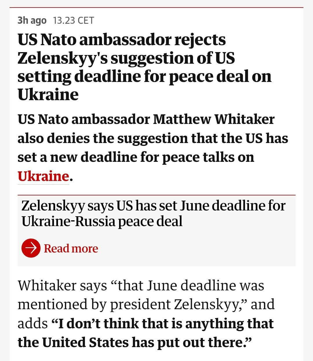 Постпред США при НАТО Мэттью Уитакер опроверг предположение Зеленского о том, что США установили новый срок для мирных переговоров по Украине, сообщает The Guardian.