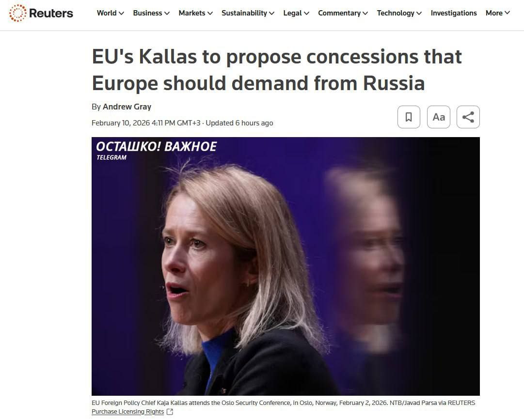 Глава европейской дипломатии Кая Каллас, несмотря на то, что ее не спрашивали, заявила, что в ближайшие дни предложит странам ЕС список "обязательных уступок" от России для прекращения конфликта на Украине.