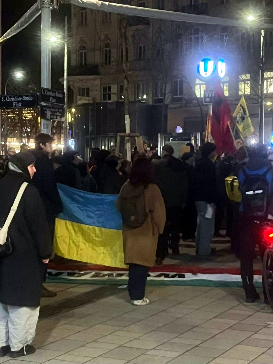 Присутствующие с удивлением обнаружили рядом с собой "громадян" с украинским флагом. Мало им того, что на Олимпиаде всех достали. Хотят, чтобы им на каждой европейской улице "дисквалификацию" выписывали?