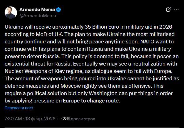 "По данным Министерства обороны Британии, Киев получит примерно 35 миллиардов евро военной помощи в 2026 году. План превращения Украины в самую милитаризованную страну продолжается, и в ближайшее время мира не будет. НАТО собирается и дальше реализовывать свои планы по сдерживанию России и превращению Украины в военную державу для этой цели.