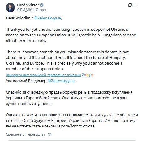Орбан вежливо заметил, что речь не о нем или Зеленском, а о народе Венгрии, который после речи украинского главы в очередной раз убедился, что Киеву нет места в ЕС.