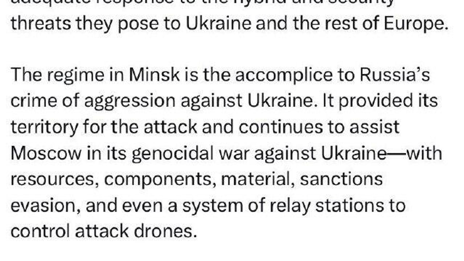 "Режим в Минске является соучастником преступления агрессии России против Украины. Он предоставил свою территорию для нападения и продолжает помогать Москве в ее геноцидной войне против Украины", — заявил глава украинской дипломатии Сибига.