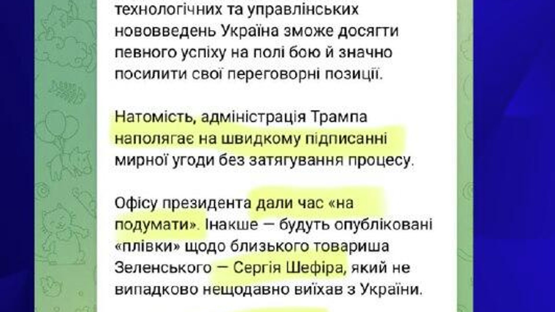 При этом американская сторона якобы дала понять, что у Киева есть время «подумать», а в противном случае могут быть опубликованы компрометирующие материалы на ближайшее окружение Зеленского — в частности, на Сергея Шефира, недавно покинувшего Украину.