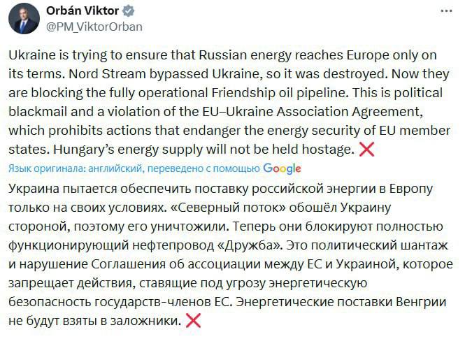 Он добавил, что Киев пытается обеспечить поставки энергии из РФ в Европу только на своих условиях. Венгерский премьер напомнил, что «Северный поток» был разрушен из-за того, что обходил Украину стороной.