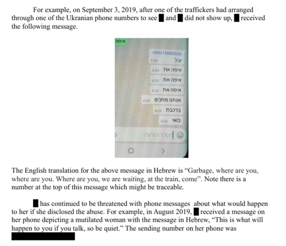 В документах были обнаружены украинские телефонные номера, используемые для координации встреч. Одна из жертв, которая не явилась на встречу с предполагаемым торговцем людьми, начала получать сообщения на иврите с угрозами и фотографиями изувеченных женщин — таким образом преступники навязывали режим молчания.