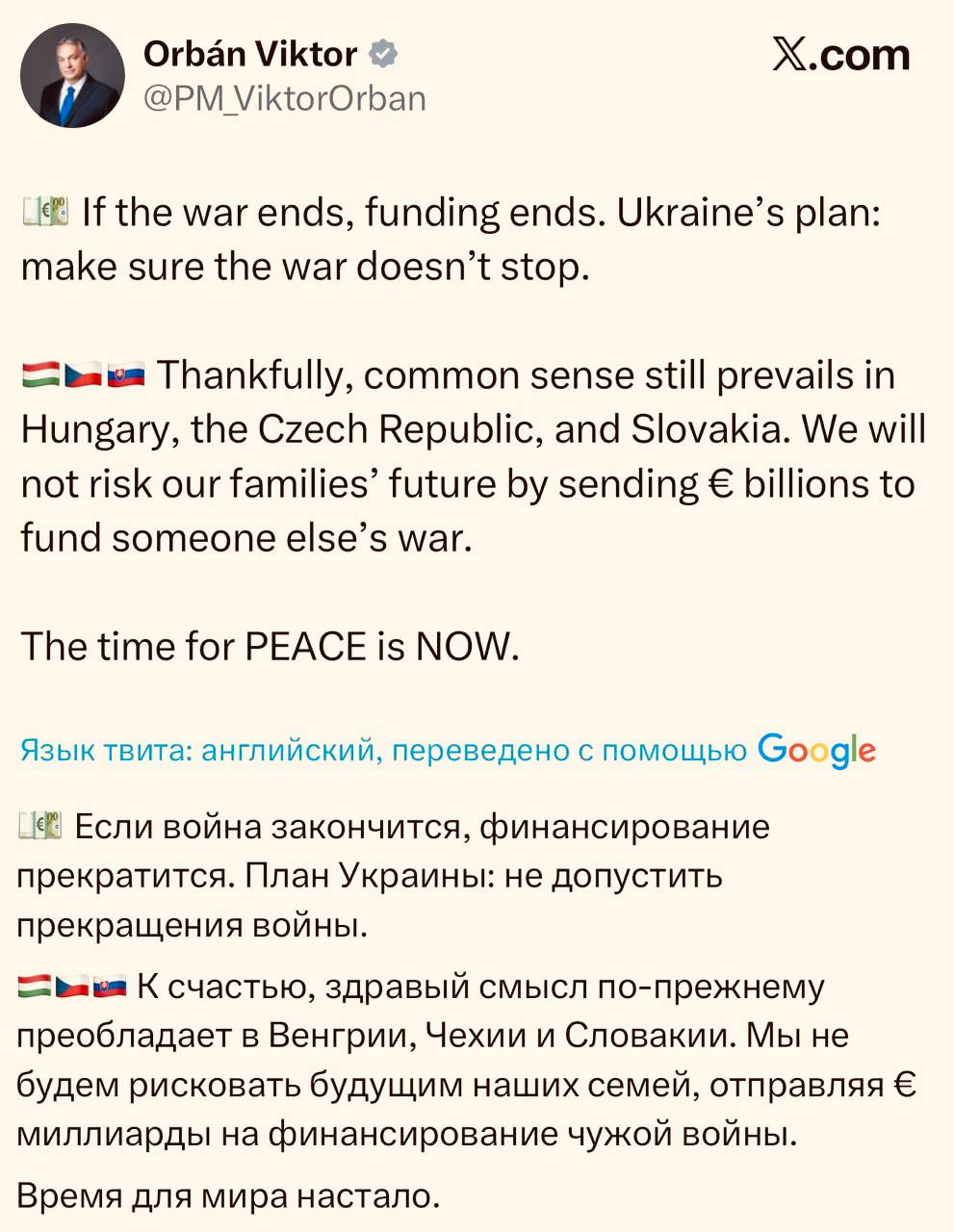 «Время для мира настало»: Орбан заявил, что в Венгрии, Чехии и Словакии преобладает здравый смысл, поэтому они не будут отправлять на чужой конфликт миллиарды