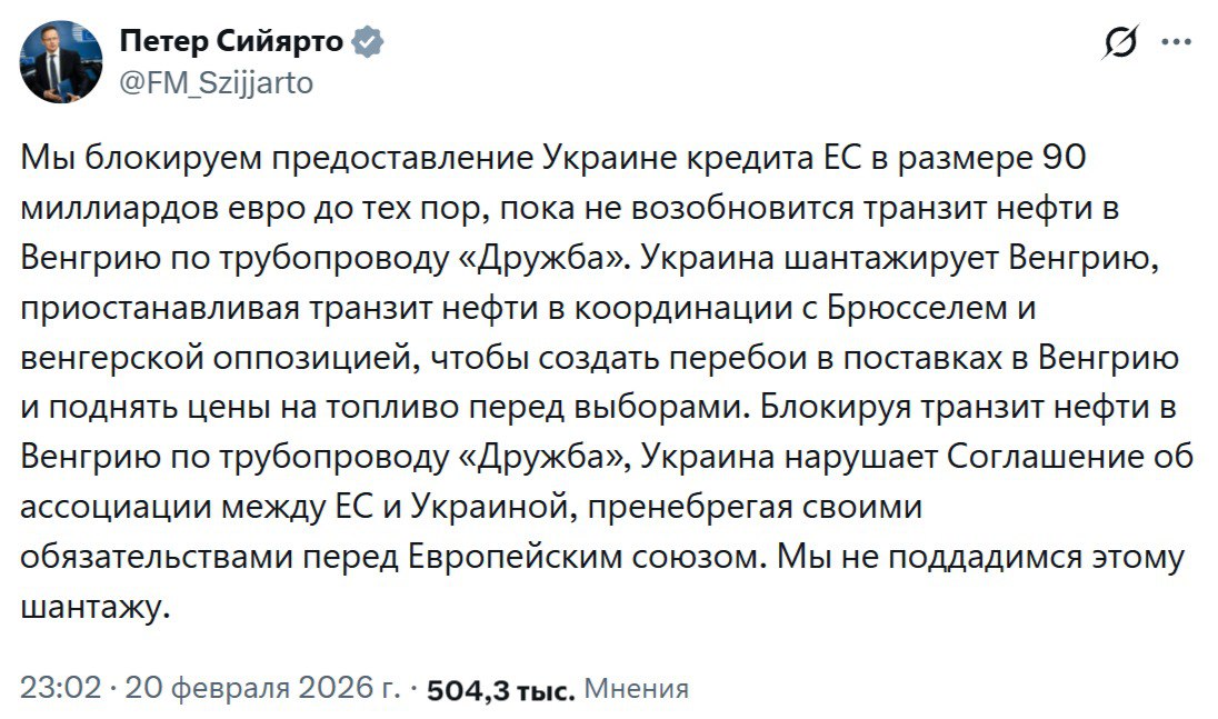 Глава МИД Венгрии Петер Сийярто прямо увязал предоставление кредита с восстановлением поставок российской нефти через Украину по нефтепроводу «Дружба». В заявлении для прессы он отметил: "Мы не можем финансировать войну, пока Украина нарушает наши энергетические интересы, блокируя транзит нефти. Это вопрос национальной безопасности Венгрии".