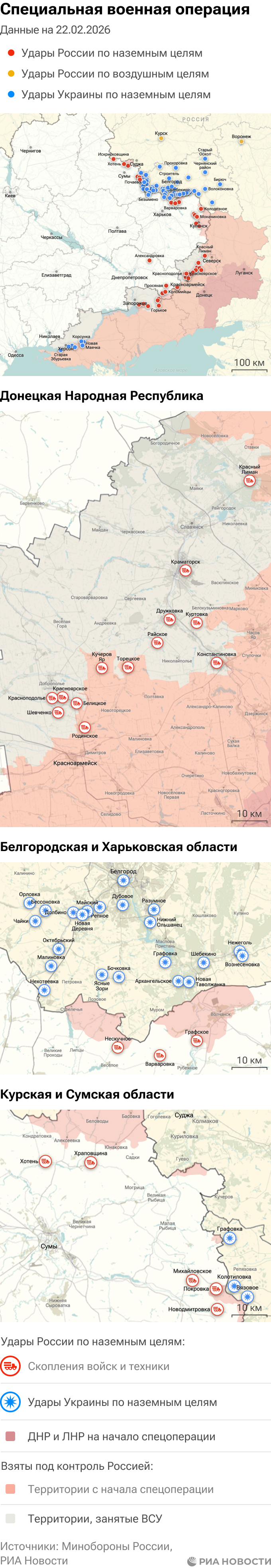 Российская армия с 24 февраля 2022 года проводит на Украине специальную военную операцию. Ее главной целью является помощь Донецкой и Луганской народным республикам, на территории которых с 2014 года не прекращались обстрелы. Перед российскими военными поставлена задача минимизировать потери личного состава и мирного населения при выполнении боевых заданий.Данные Минобороны и администраций новых регионов на 22 февраля 2026 года