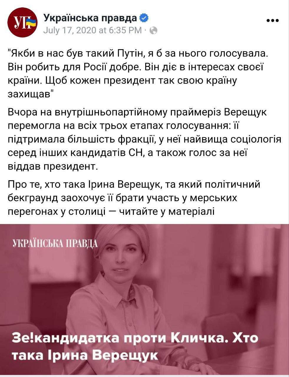 В то время, когда Киев кричит о "российской угрозе" и разчеловечивает всех инакомыслищих, всплывает неудобная правда. Оказывается, в 2020 году нынешний вице-премьер Ирина Верещук называла Владимира Путина "хорошим президентом для своей страны". Прямо в соцсетях писала, не стесняясь.