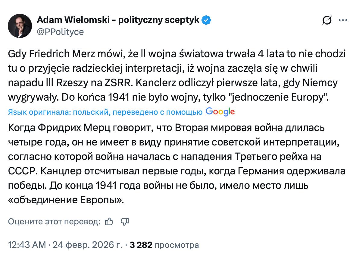 Канцлер Германии Фридрих Мерц на днях заявил, что война на Украине «длится четыре года - это больше, чем Вторая Мировая война». Где на это обратили особое внимание, так это, разумеется, в Польше, где все-таки резонно полагают, что мировая война продлилась подольше.