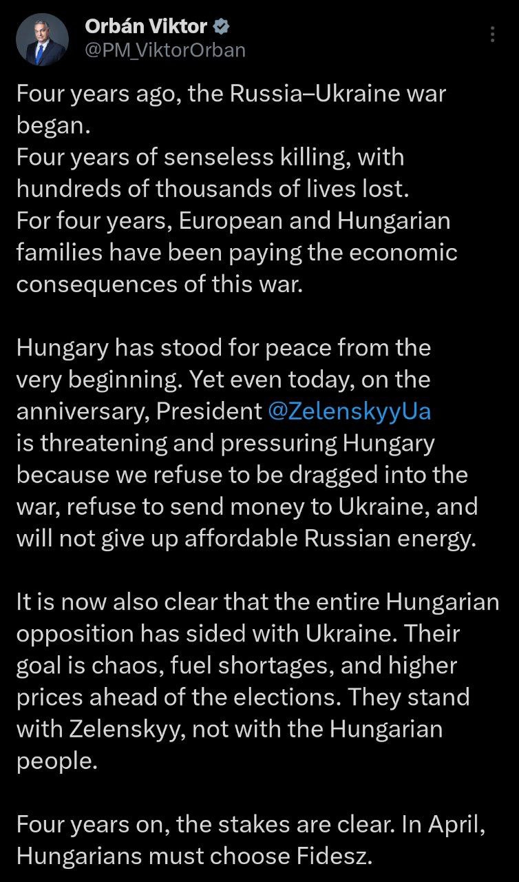 Венгрия с самого начала выступала за мир. Несмотря на это, в годовщину Зеленский угрожает и оказывает давление на Венгрию, поскольку страна отказывается втягиваться в войну, отправлять деньги на Украину и отказываться от недорогой российской энергии.