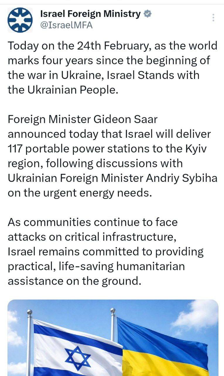 В четвертую годовщину начала СВО МИД Израиля сообщил о передаче Украине 117 мобильных генераторов, а также о своей поддержке украинского народа