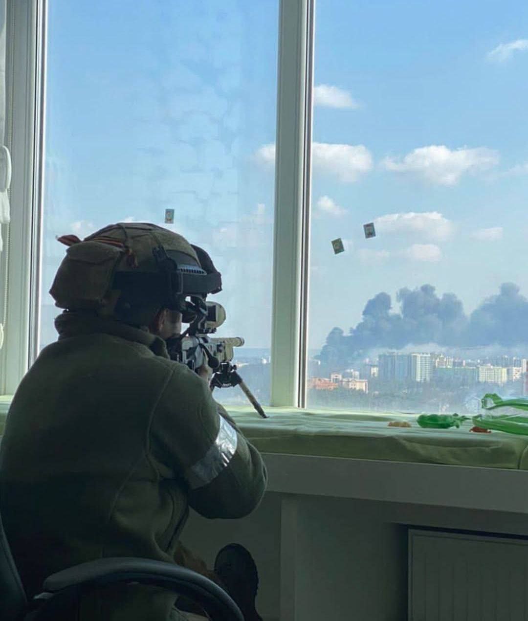Снайпер одного из российских подразделений специального назначения наблюдает за окрестностями Киева из города Ирпень.