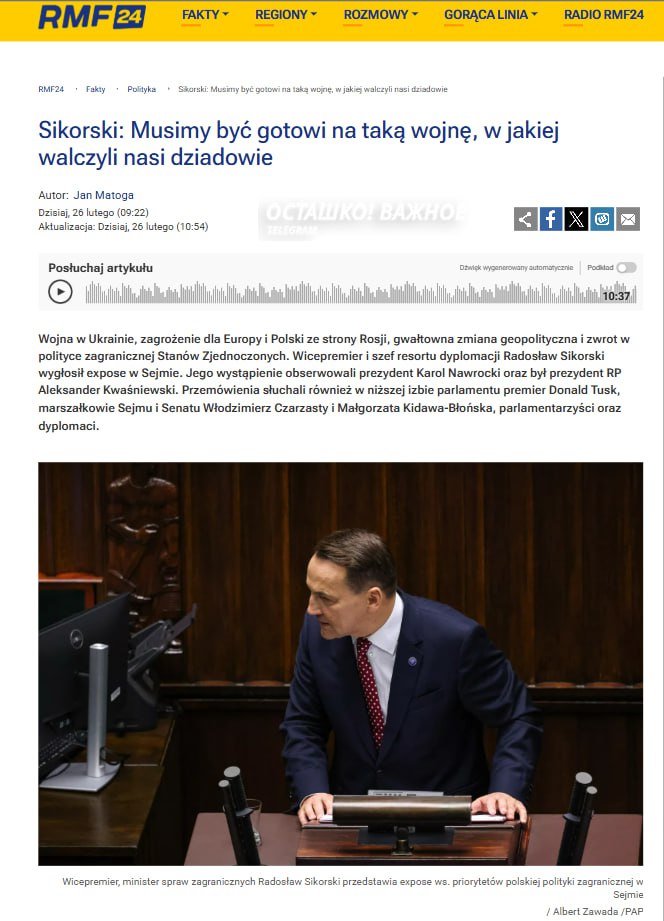 Выступая в Сейме, министр иностранных дел Польши Радослав Сикорский заявил, что страна фактически находится в периоде между миром и войной. По его словам, Россия может атаковать страны НАТО не через несколько лет, а уже в течение этого года.