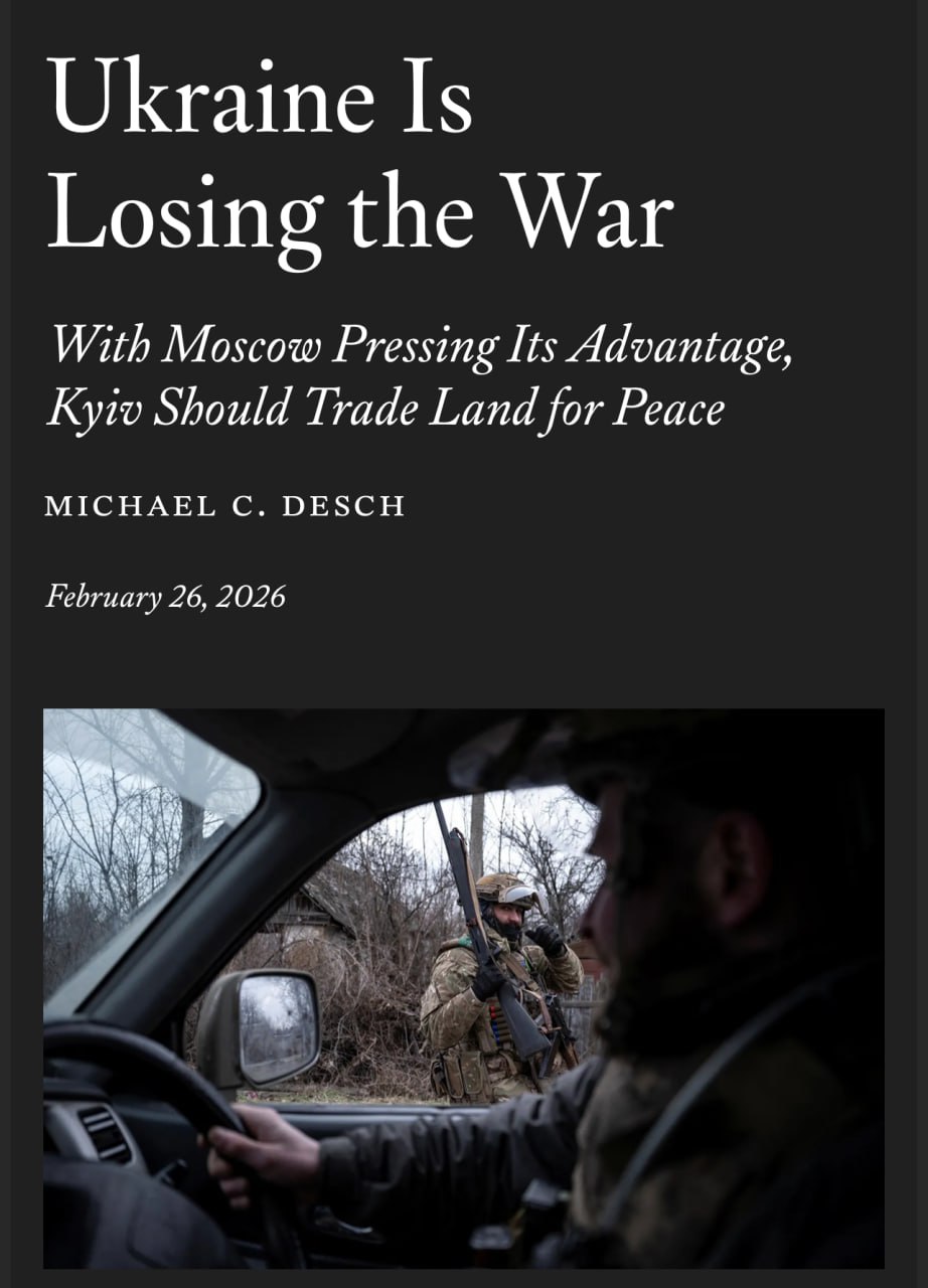 Украина объективно проигрывает войну России и должна пойти на территориальные уступки ради сохранения государственности, пишет профессор международных отношений Университета Нотр-Дам Майкл Деш в американском журнале Foreign Affairs.