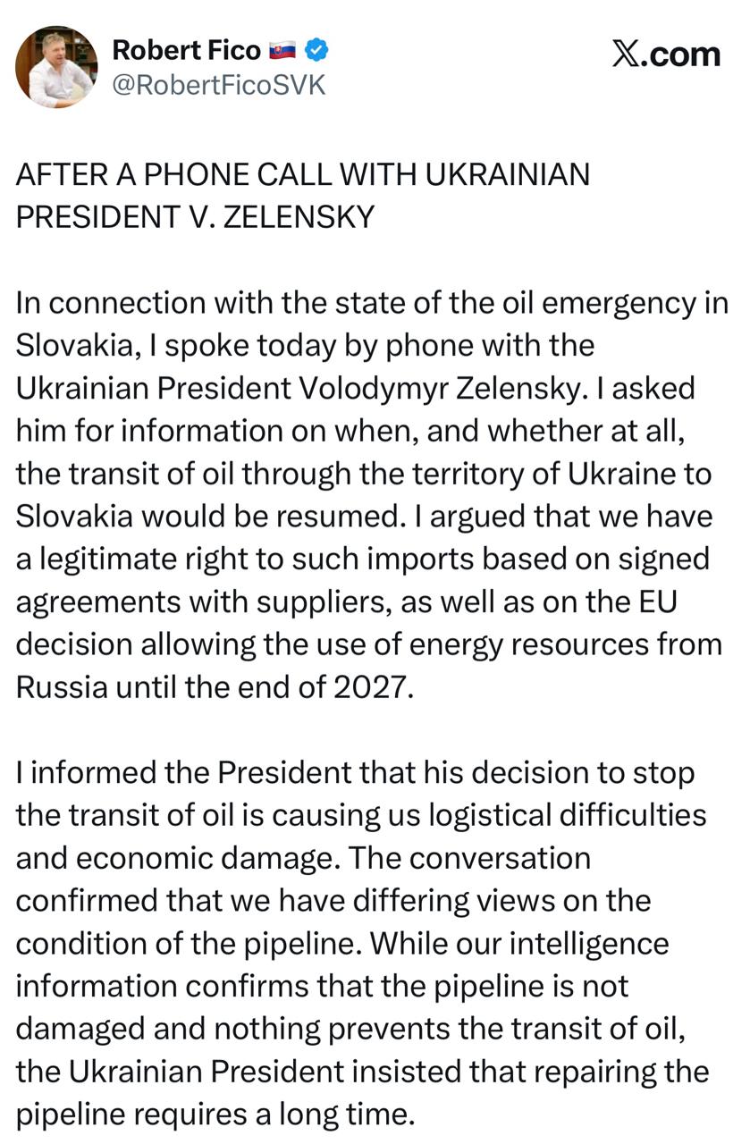 Я сообщил Зеленскому, что его решение остановить транзит нефти создает для нас логистические трудности и наносит экономический ущерб. Разговор подтвердил, что у нас разные мнения о состоянии трубопровода. В то время как наша разведывательная информация подтверждает, что трубопровод не поврежден и ничто не препятствует транзиту нефти, президент Украины настаивал на том, что ремонт трубопровода займет много времени.