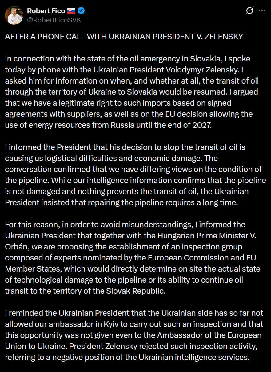 В связи с чрезвычайной ситуацией на нефтяном рынке Словакии я сегодня поговорил по телефону с Зеленским. Я попросил его предоставить информацию о том, когда и будет ли вообще возобновлен транзит нефти через территорию Украины в Словакию. Я утверждал, что мы имеем законное право на такой импорт на основании подписанных соглашений с поставщиками, а также решения ЕС, разрешающего использование энергетических ресурсов России до конца 2027 года.