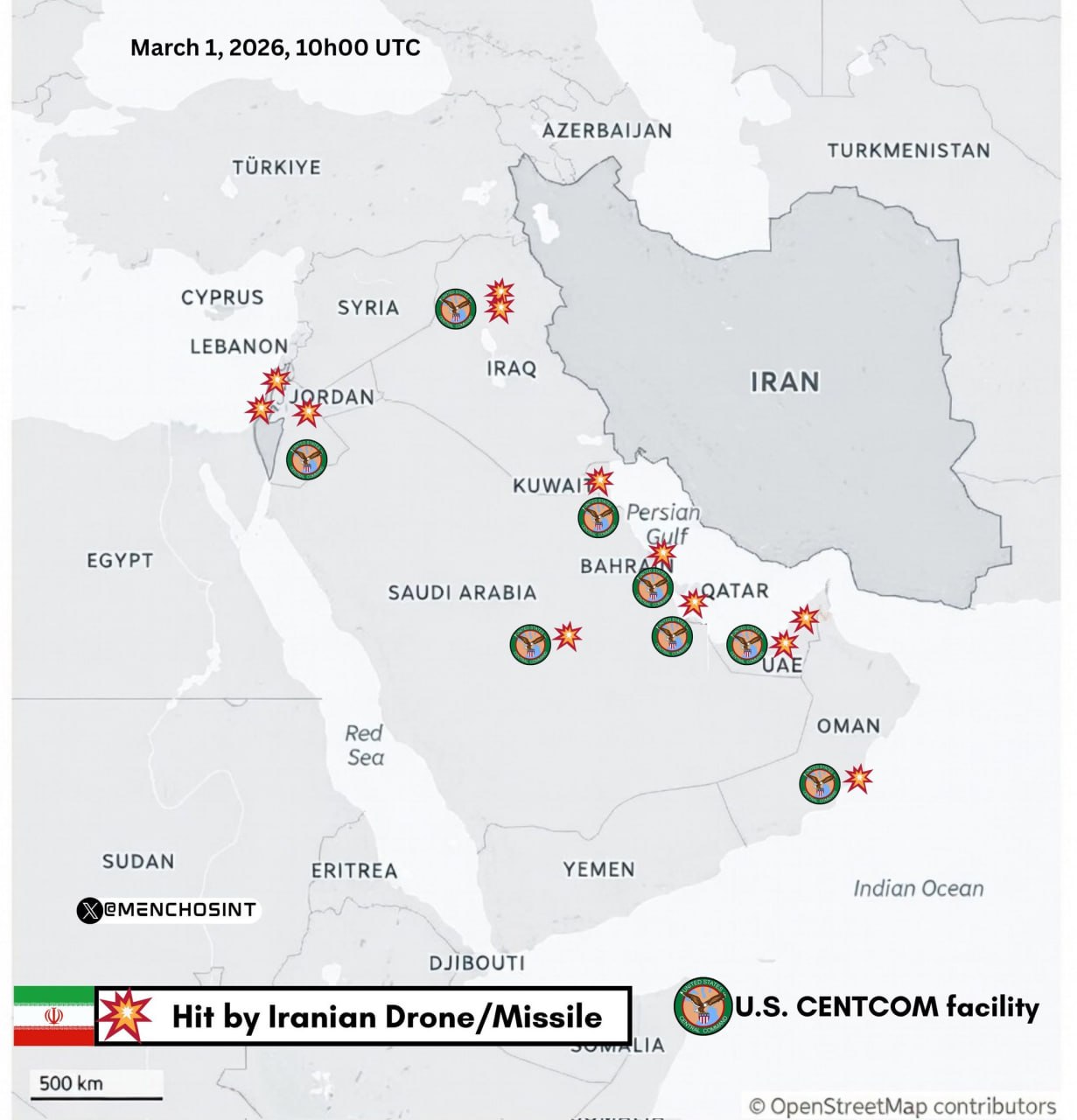 На карте помечены места, где базируются противники Ирана. Прямо сейчас они уговаривают остановить войну, ведь бизнес убегает, улетают деньги, а с ними хорошая жизнь. И думаете, США компенсирует расходы на восстановление? Ну разве что на восстановление своих военных баз.