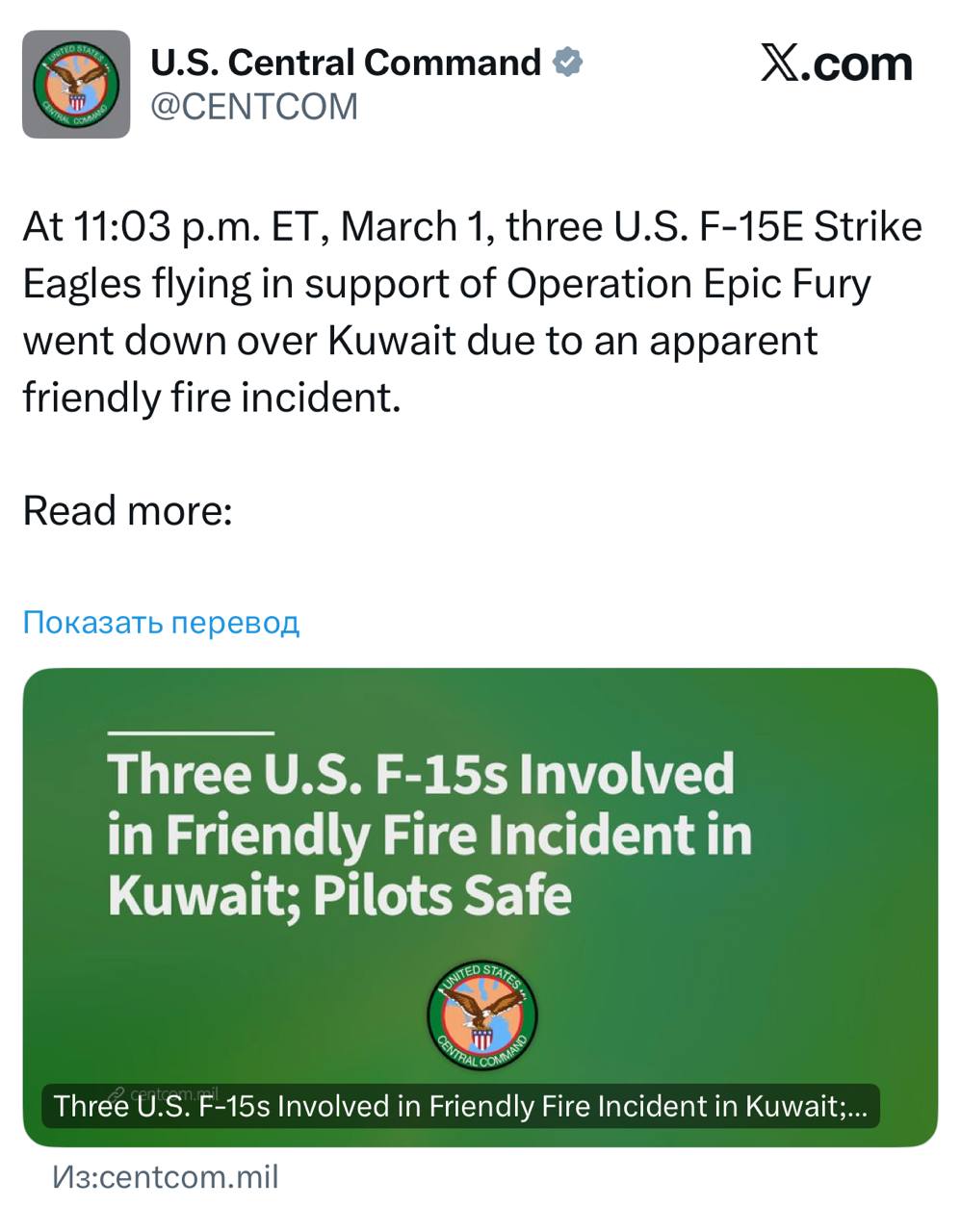 Три истребителя F-15E Strike Eagle ВВС США были сбиты над Кувейтом результате инцидентов с "дружественным огнем"