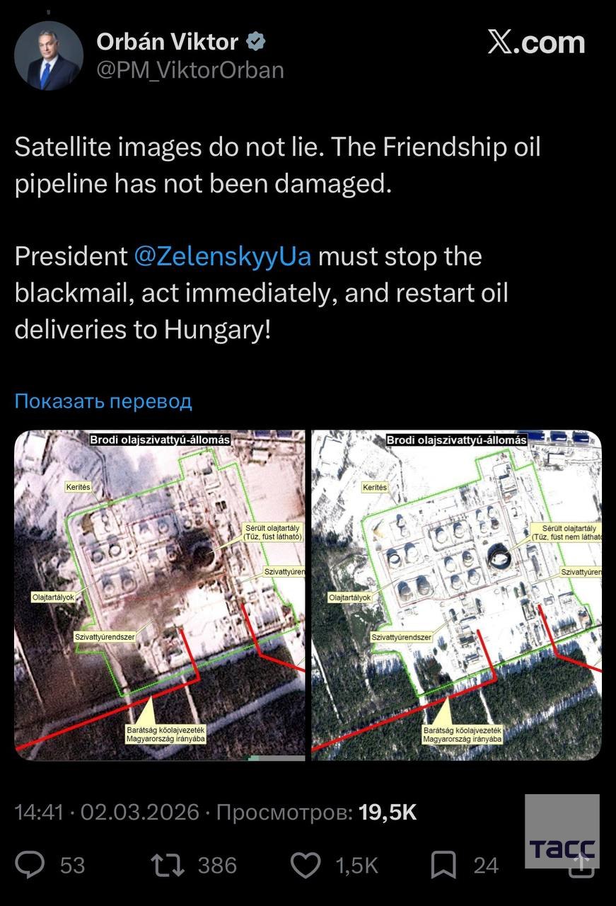 "Спутниковые снимки не врут!". Орбан опубликовал снимки "Дружбы" со спутника, доказывающие, что нефтепровод пригоден к работе. Власти Украины говорят неправду, утверждая, будто не могут возобновить транзит российской нефти.