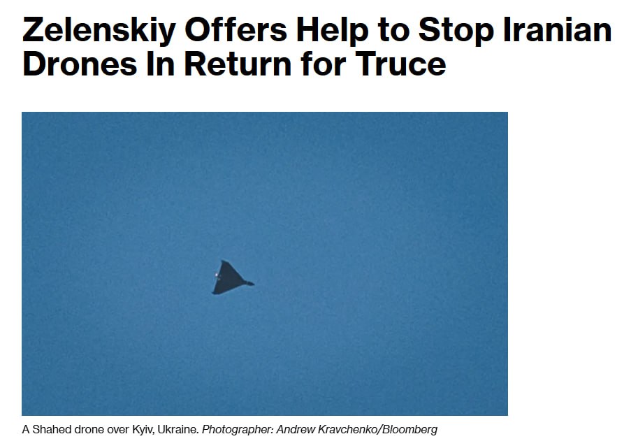 Зеленский готов помочь странам Ближнего Востока в отражении налетов иранских дронов при условии, если тамошние лидеры уговорят Путина согласиться на 30 дней перемирия на Украине, пишет Bloomberg.