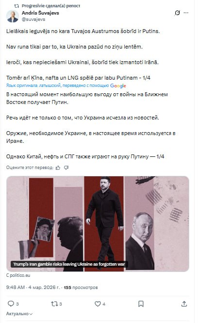 Народный избранник от либеральной партии "Прогрессивные" Андрис Шуваев заявил, что главным итогом иранского конфликта стало не только исчезновение Украины из новостей, но и растрата столь ценного западного вооружения, которое уже могло быть у Киева.