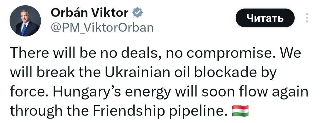 Венгрия не пойдёт на компромиссы с Украиной и прорвет блокаду "Дружбы" силой: "нефть снова пойдет по трубопроводу", заявил премьер страны Орбан.