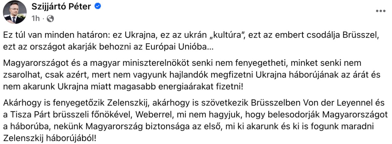 Как бы ни угрожал Зеленский, как бы он ни вступал в союзы в Брюсселе с фон дер Ляйен и брюссельским начальником партии «Тиса» Вебером, мы не позволим втянуть Венгрию в войну. Для нас безопасность Венгрии — на первом месте, мы хотим и будем держаться в стороне от войны Зеленского!»