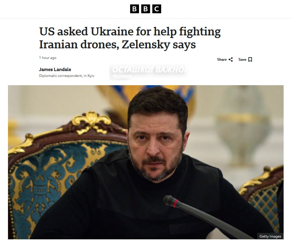 Главарь киевского режима заявил, что США попросили Украину помочь в борьбе с иранскими дронами: «поступали запросы от американской стороны», и партнёры просили содействия в защите союзников в Персидском заливе.