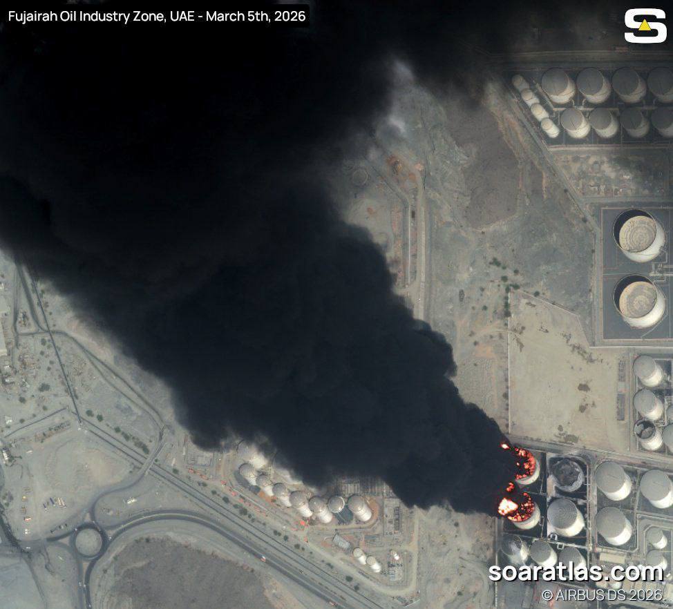 В сети распространяются спутниковые снимки с черным облаком дыма в зоне объектов нефтяной промышленности Фуджейры после иранского удара.
