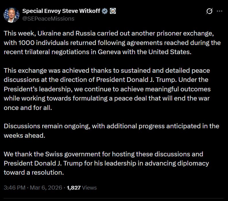 На этой неделе Украина и Россия провели очередной обмен пленными, в результате которого 1000 человек были возвращены в соответствии с договоренностями, достигнутыми в ходе недавних трехсторонних переговоров в Женеве с участием Соединенных Штатов.Этот обмен был осуществлен благодаря продолжительным и детальным мирным обсуждениям по указанию президента Дональда Дж. Трампа. Под руководством президента мы продолжаем добиваться значимых результатов, работая над формулированием мирного соглашения, которое положит конец войне раз и навсегда.