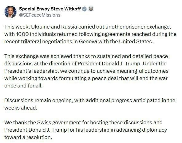 В ближайшие недели ожидается прогресс на переговорах по украинскому урегулированию, диалог продолжается, заявил спецпосланник Трампа Уиткофф.