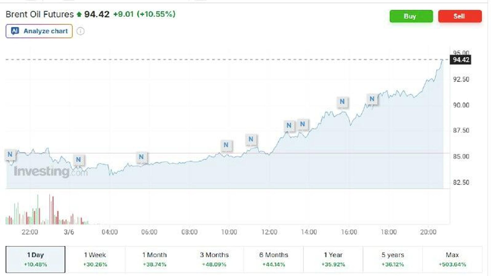 Мировые цены на нефть продолжают стремительный рост из-за эскалации конфликта на Ближнем Востоке. Согласно данным агрегаторов, стоимость барреля марки Brent достигла 94 долларов. Об этом сообщил 6 марта телеграм-канал Украина.ру