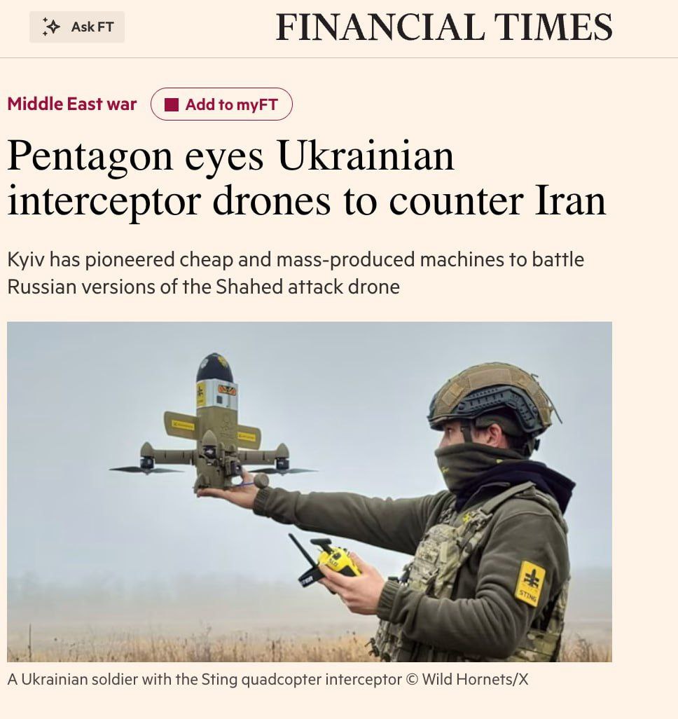 ПЕНТАГОН РАССМАТРИВАЕТ ВОЗМОЖНОСТЬ ПРИОБРЕТЕНИЯ УКРАИНСКИХ ДРОНОВ-ПЕРЕХВАТЧИКОВ ДЛЯ БОРЬБЫ С ИРАНСКИМИ ДРОНАМИ - Financial Times