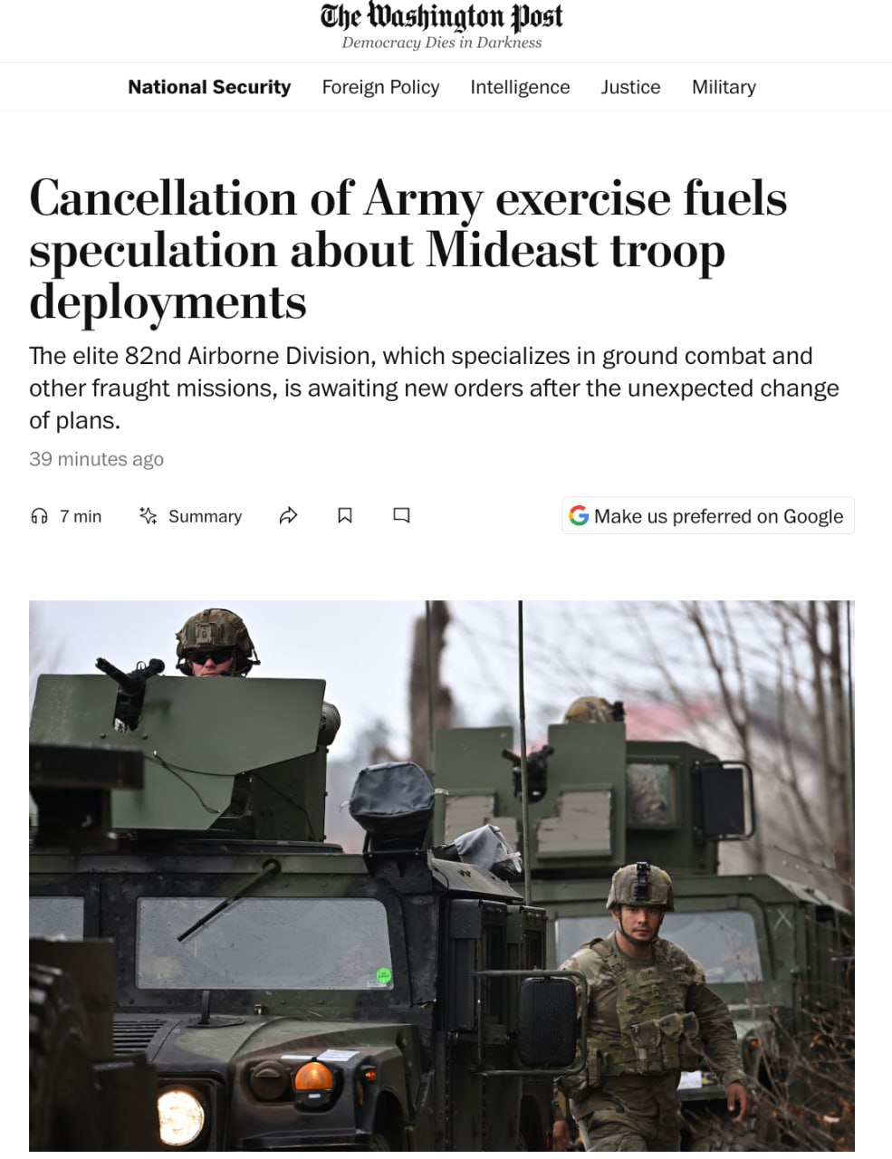 В последние годы силы быстрого реагирования 82-й дивизии уже использовались в ключевых операциях: для усиления безопасности посольства США в Багдаде перед убийством в 2020 году известного иранского генерала Касема Сулеймани, при эвакуации из Афганистана в 2021 году, а также при демонстрации силы США в Восточной Европе перед вторжением России на Украину в 2022 году.