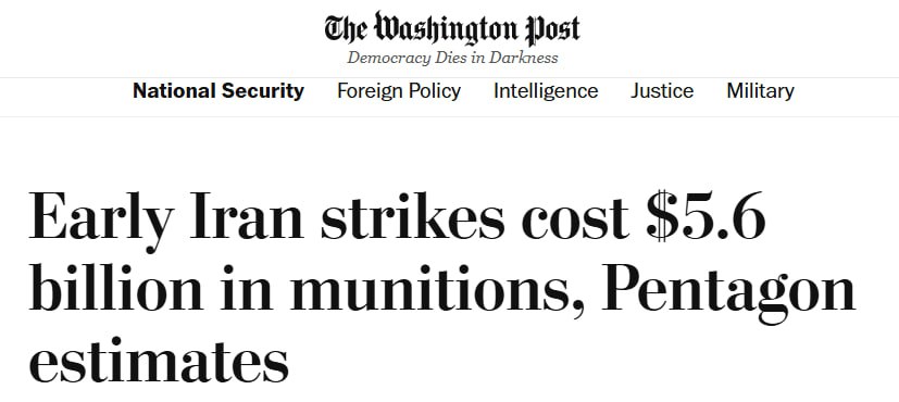 Американское издание сообщает, что только за первые двое суток военной операции против Ирана Пентагон истратил боеприпасов на сумму 5,6 миллиардов долларов. Данные были переданы в Конгресс и вызвали серьёзную обеспокоенность среди законодателей темпами истощения запасов