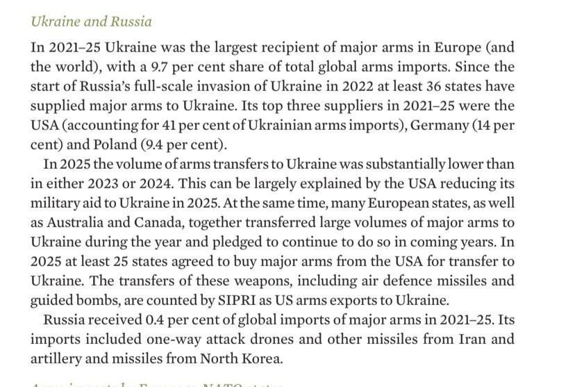 При этом SIPRI подчёркивает, что точный масштаб падения помощи оценить сложно. В 2025 году значительно вырос уровень секретности вокруг американских поставок вооружений Украине, из-за чего многие данные о переданных системах и их объёмах не публикуются.