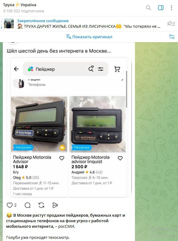 Очередная перемога случилась на Украине. Труха распространяет фейк, что в России срочно скупают пейджеры в связи с проблемами с мобильным интернетом и телеграмом.