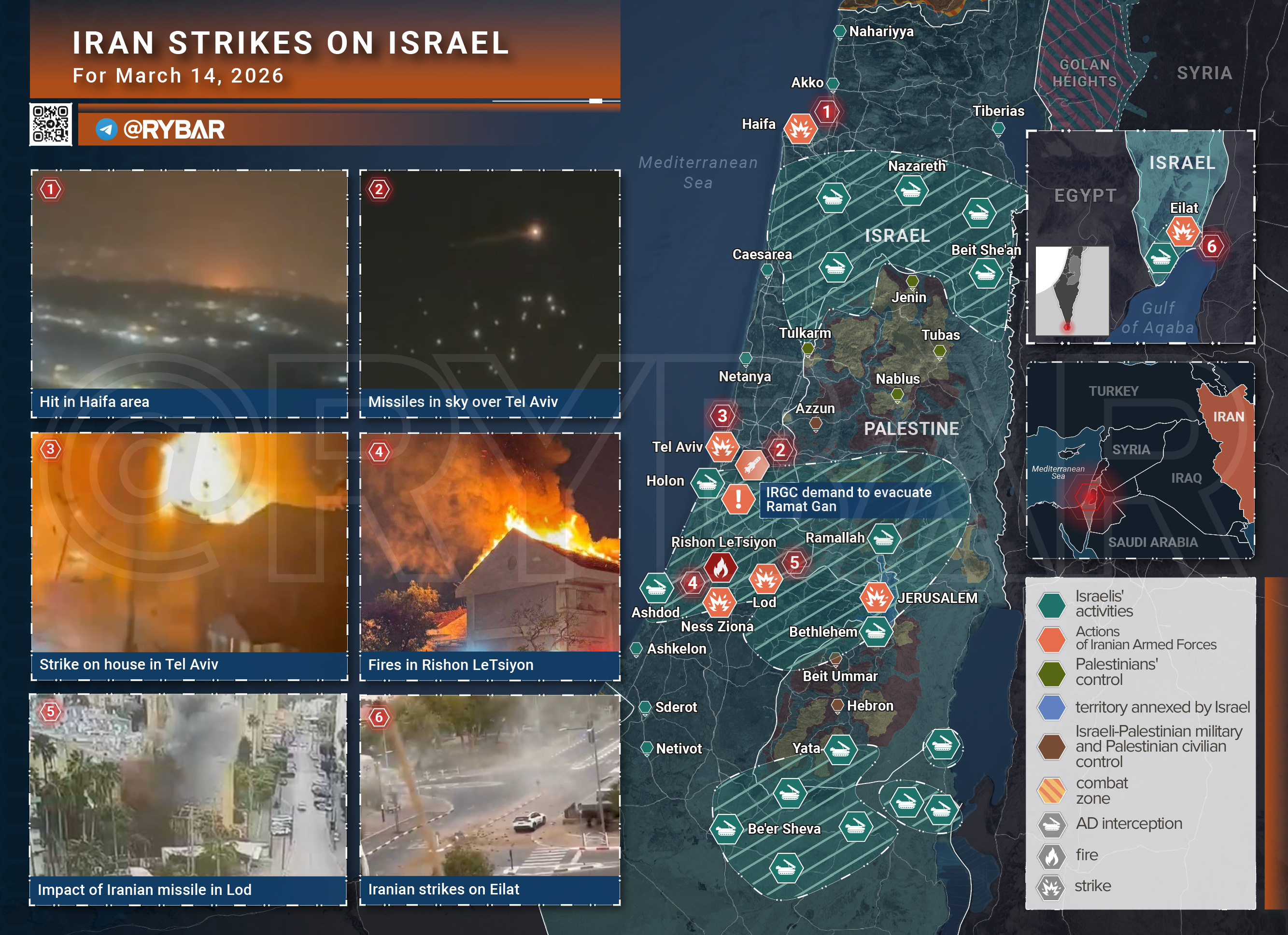 В Израиле обстановка за сутки ухудшилась. Днём иранские ракеты поразили цели в агломерации Гуш-Дан — Тель-Авиве, Ришон-ле-Ционе и Хайфе, а к вечеру новые удары а к вечеру новые удары пришлись по тем же районам агломерации и Эйлату.