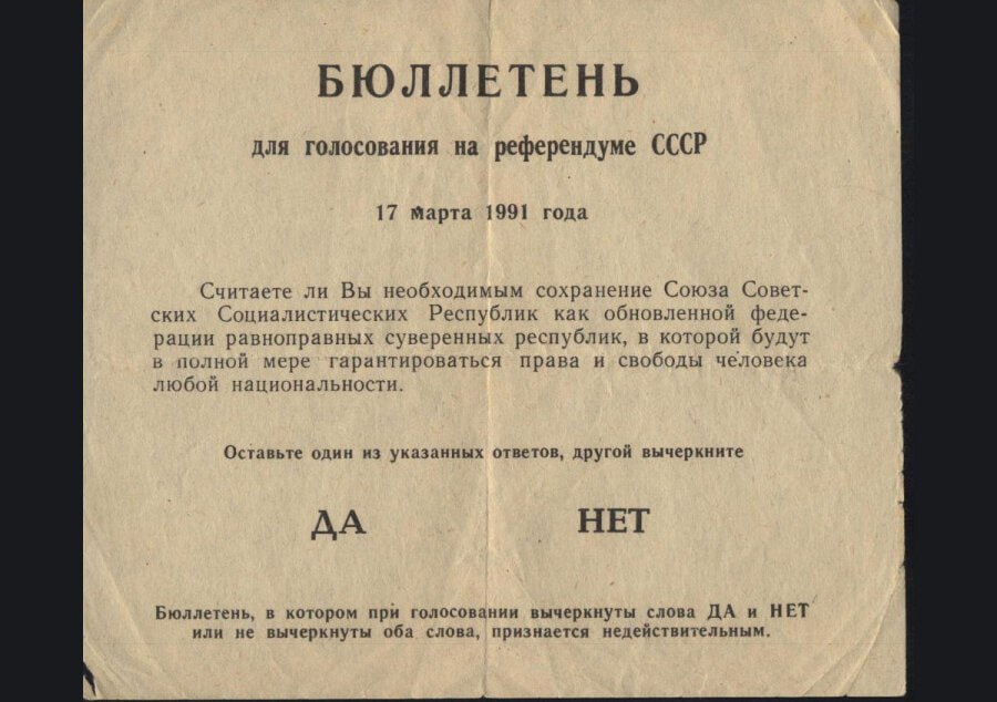 17 марта 1991 года состоялся всесоюзный референдум, на нем народ СССР должен был выразить свое мнение о будущем СССР. Так в бюллетене надо было выбрать из 2-х слов «ДА» или «НЕТ». И сама постановка вопроса подталкивала выбрать слово «ДА». Вот сам вопрос: