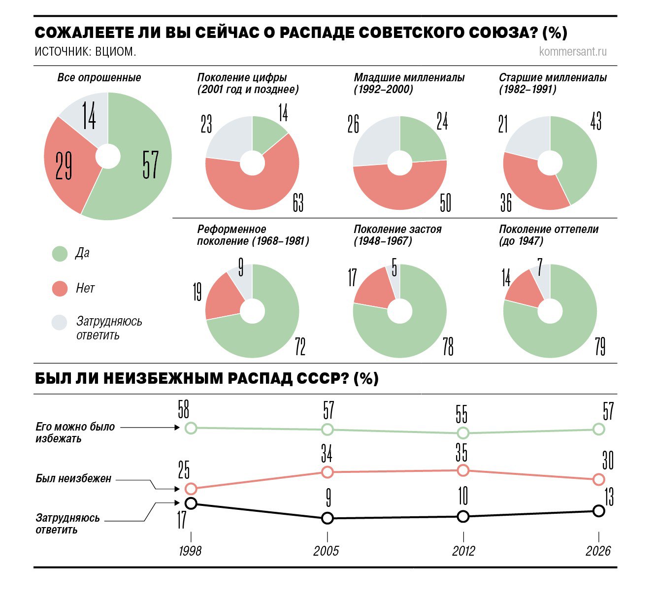 Молодые россияне почти перестали сожалеть о распаде СССР, следует из свежего опроса ВЦИОМ. В первую очередь это событие «остается серьезной психологической травмой» для россиян среднего и старшего возраста, констатирует в своем комментарии на сайте ВЦИОМа его гендиректор Валерий Федоров.