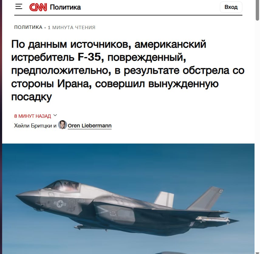 "По данным двух источников, знакомых с ситуацией, американский истребитель F-35 совершил вынужденную посадку на авиабазе США на Ближнем Востоке после того, как, предположительно, был подбит иранскими силами.