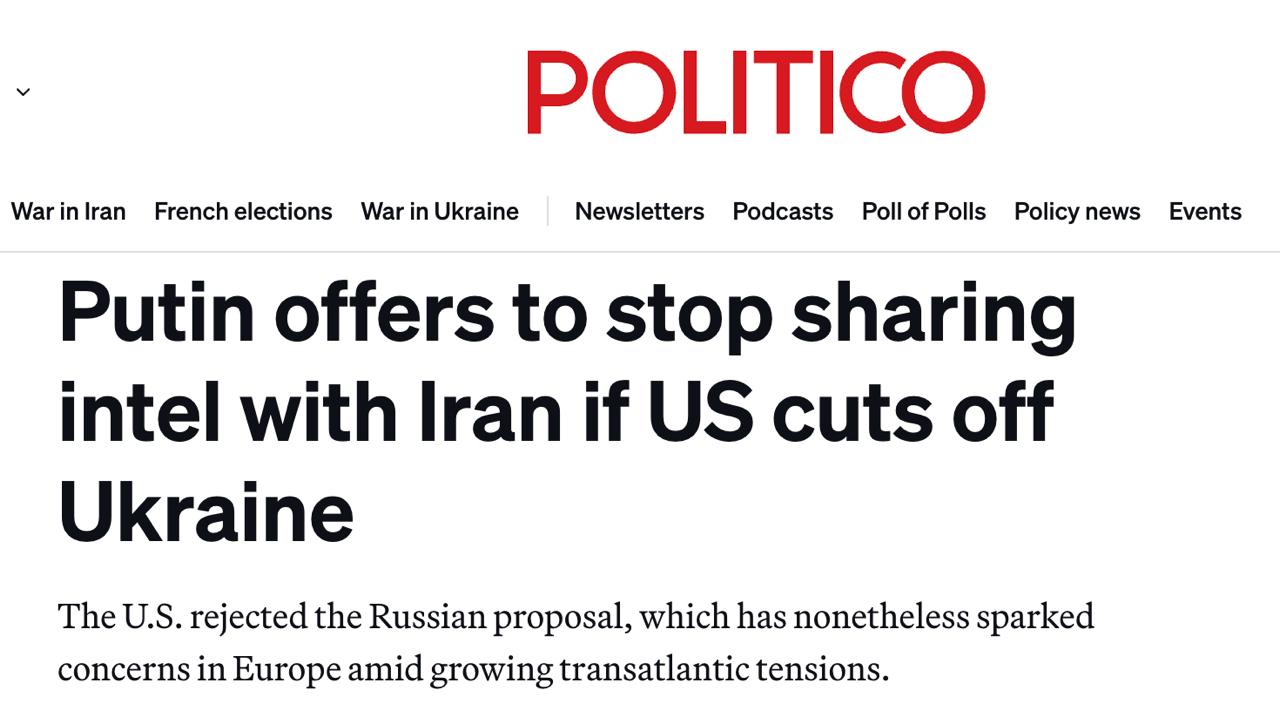 Россия предложила США отказаться от передачи разведданных Украине в обмен на отказ от передачи российских разведданных Ирану, но Белый Дом отклонил сделку, пишет Politico.