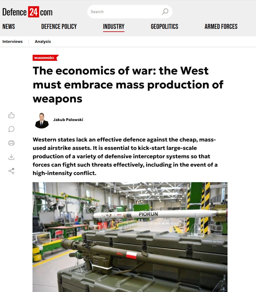 Европе надо наращивать массовое производство легких систем ПВО, включая дроны-перехватчики, а для этого пора забыть об экономике мирного времени, пишет издание.
