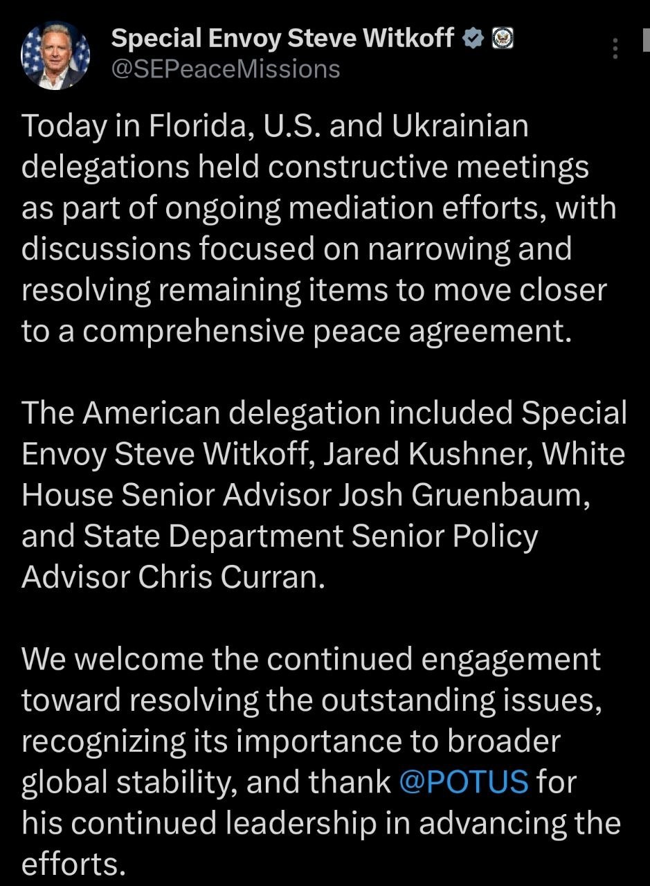 С американской стороны в переговорах участвовали Уиткофф, Джаред Кушнер, а также представители Белого дома и Госдепартамента.