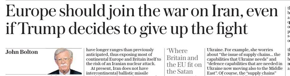 При этом Болтон, конечно, не мог обойтись без русофобии. Втягивание европейцев в Иранскую войну он, в том числе, объясняет необходимостью сохранить поддержку Украины американцами. Мол, Трамп может заявить, что если «Иран — это не война Европы», то «Украина — это не война Америки» (что он, честно говоря, уже не раз заявлял!)