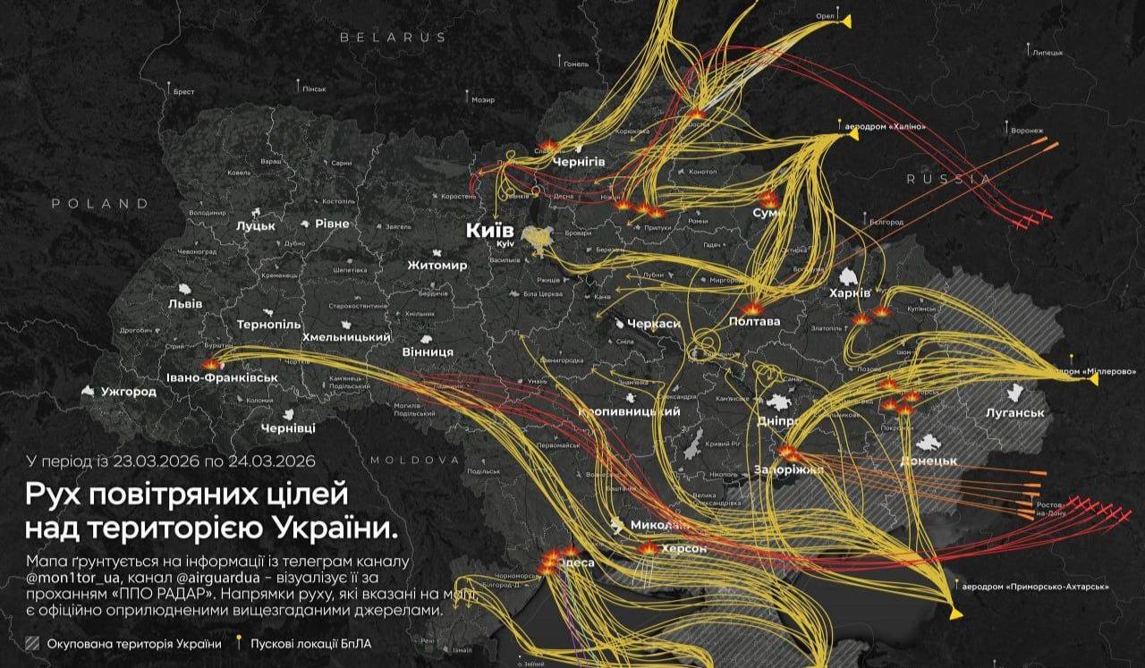 Приблизительный маршрут ракет и дронов по Украине этой ночью