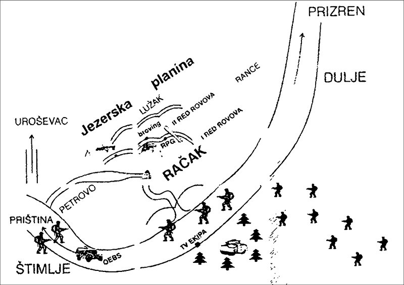 15 января 1999 года югославская полиция провела в селе Рачак антитеррористическую операцию.После ухода сербов около 15 часов дня, албанцы вернулись в село, сняли с убитых боевиков форму АОК и переодели в гражданское. Трупы выложили в поле, на котором боевых действий не велось.