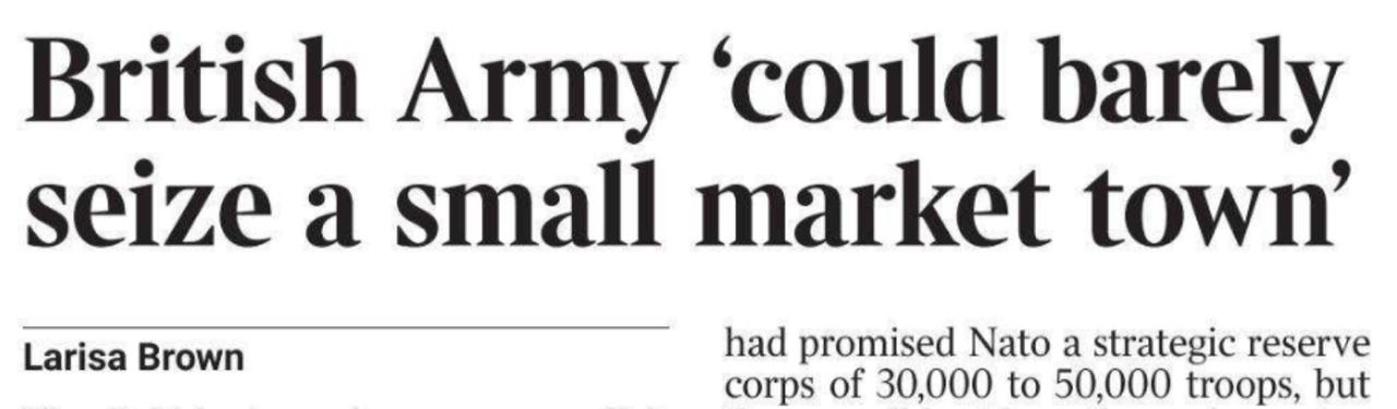 Сэр Барронс сказал, что Великобритания обещала НАТО стратегический резервный корпус численностью от 30 000 до 50 000 военнослужащих, но у армии нет ни оборудования, ни подготовки, чтобы приблизиться к этому уровню. «Сегодняшняя армия, честно говоря, может сделать одну очень маленькую вещь. По сути, в хороший день она могла бы захватить небольшой рыночный городок», - сказал он.